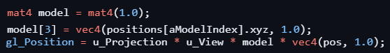 However, if I caculate the model matrices in the compute shader, not only can I have each invocation do its own calculation in parallel with others, but they also just have to do it once each. (An invocation is responsible for calculating the position, velocity and acceleration of a boid. It will also be appropriate for an invocation to calculate the model matrix that represents its boid.) Finally, in the vertex shader, I just need to fetch the corresponing and calculated model matrix.
