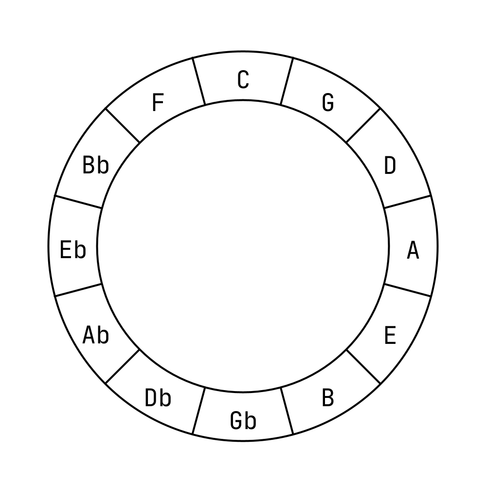 As you can see, the notes are not arranged in an alphabetical order. In fact, they are arranged in a way so that the neighboring note in the clockwise rotation is a perfect fifth away, and a perfect fifth is an interval. For example, the note G is a perfect fifth away from the note C, and the note Ab is a perfect fifth away from the note Db.
