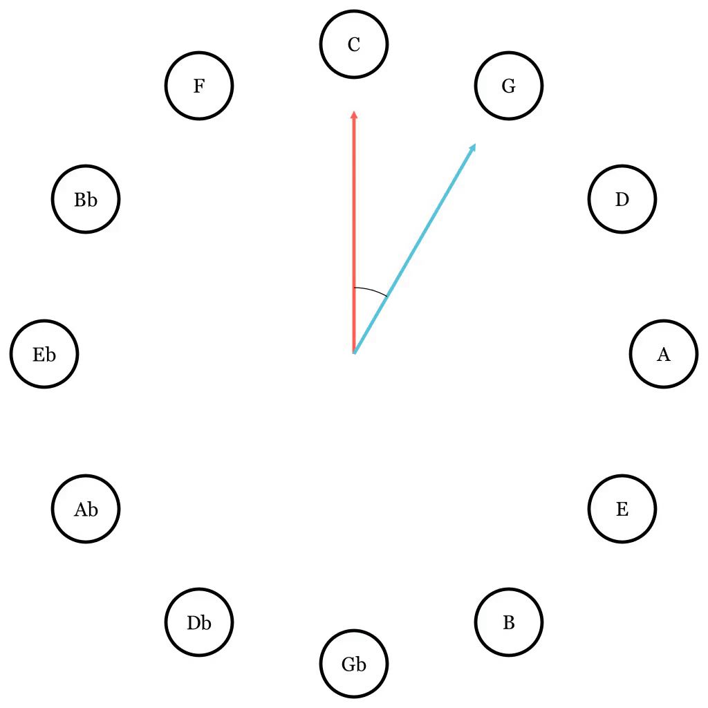 More specifically, we are interested in the acute angle between two notes on the Circle of Fifth, such as this: